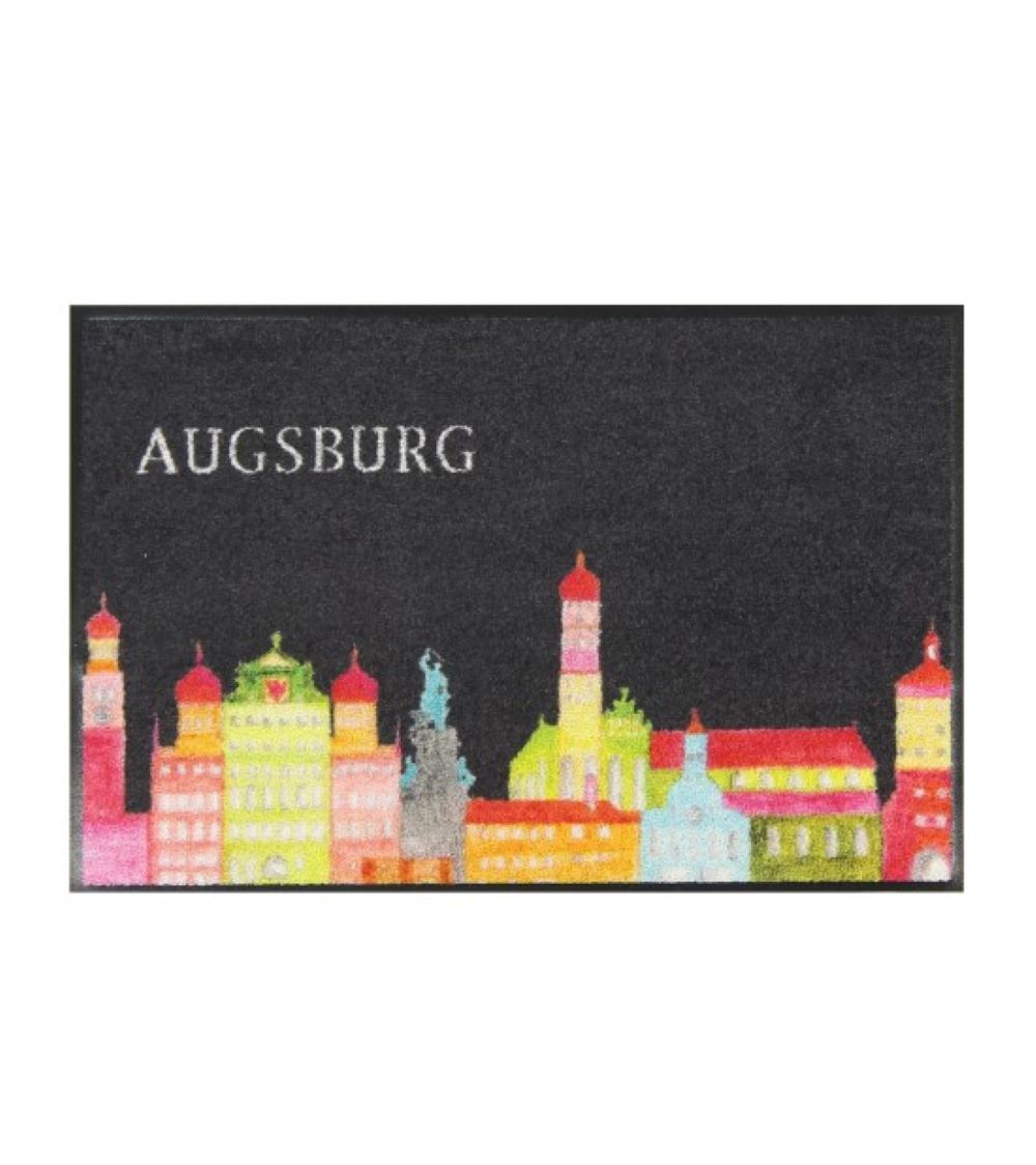 N&K: Wohnmatte Augsburg – exklusiv bei N&K! Auf dieser außergewöhnlichen Wohnmatte Augsburg sind Wahrzeichen der Stadt Augsburg zu sehen, z. B. das Augsburger Rathaus oder den Perlachturm. Fröhlich bunt sind die Motive von einer lokalen Künstlerin exklusiv für N&K auf den praktischen, dunklen Hintergrund gewürfelt. Das Material ist hochwertig getuftet auf einem Kunststoffträger. Die Größe mit 50x75cm genau passend vor den Hauseingang, aber auch vor die Balkon- oder Terrassentür. Hergestellt wird die Fußmatte Augsburg in Deutschland und ist exklusiv nur bei N&K Bielefelder Wäsche erhältlich. Die Fußmatte ist besonders pflegeleicht und strapazierfähig und lässt sich sogar problemlos in der Waschmaschine reinigen.